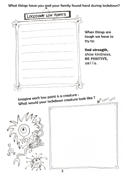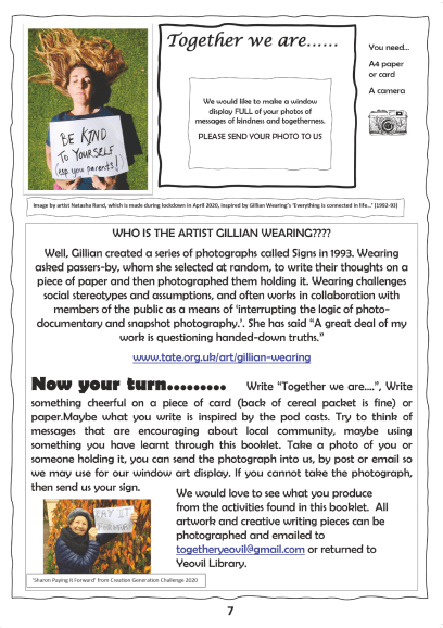 Put together by artist Natasha Rand (Creation Generation) with Yeovil Library, a 12 pages activity pack contains a range of creative activities for primary school age children and their family, part of our ‘Together We Are Stronger’ community project.