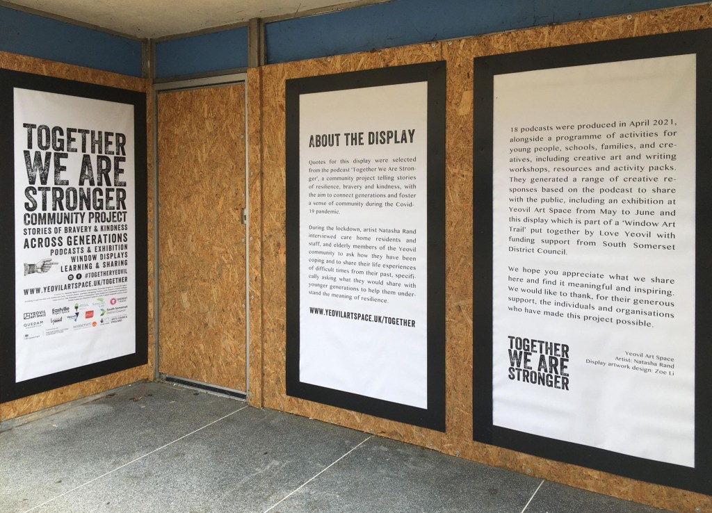 An installation designed with the quotes from the podcast has been installed at 96 High Street, the former St Margaret’s Hospice Charity Shop. Part of Window Art Trail by Love Yeovil.