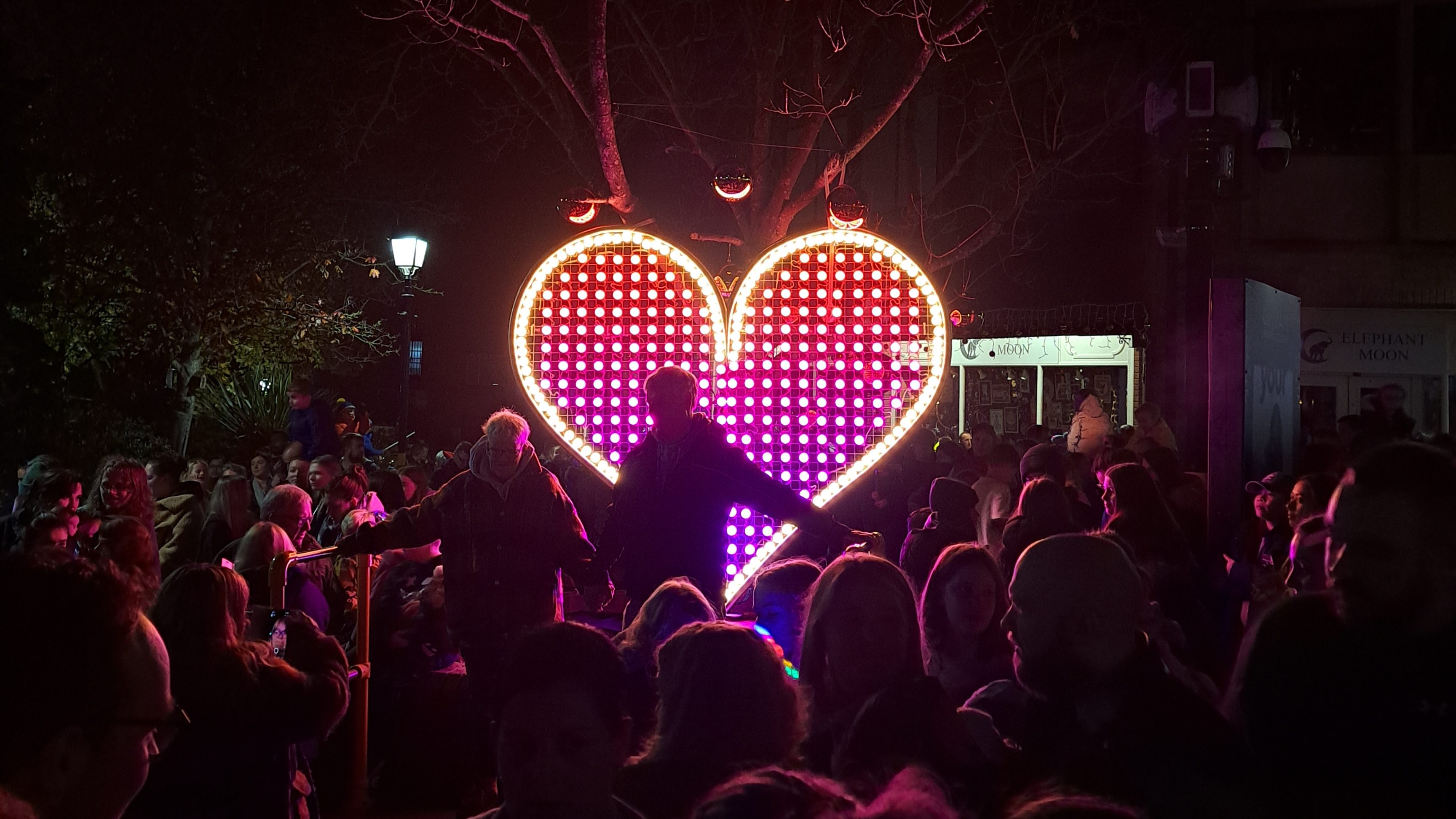‘Light Hearted’ is now with us in the gallery! Also featured at Yeovil’s Christmas Lights Switch On event and the Sound of Yeovil Silent disco, this stunning LED heart now sits in Yeovil Art Space for the lead up to Christmas and is providing a bright and beautiful centrepiece for our festive exhibition. When you stand in front of it and hold hands the heart lights up! Come in to the gallery and have a go!