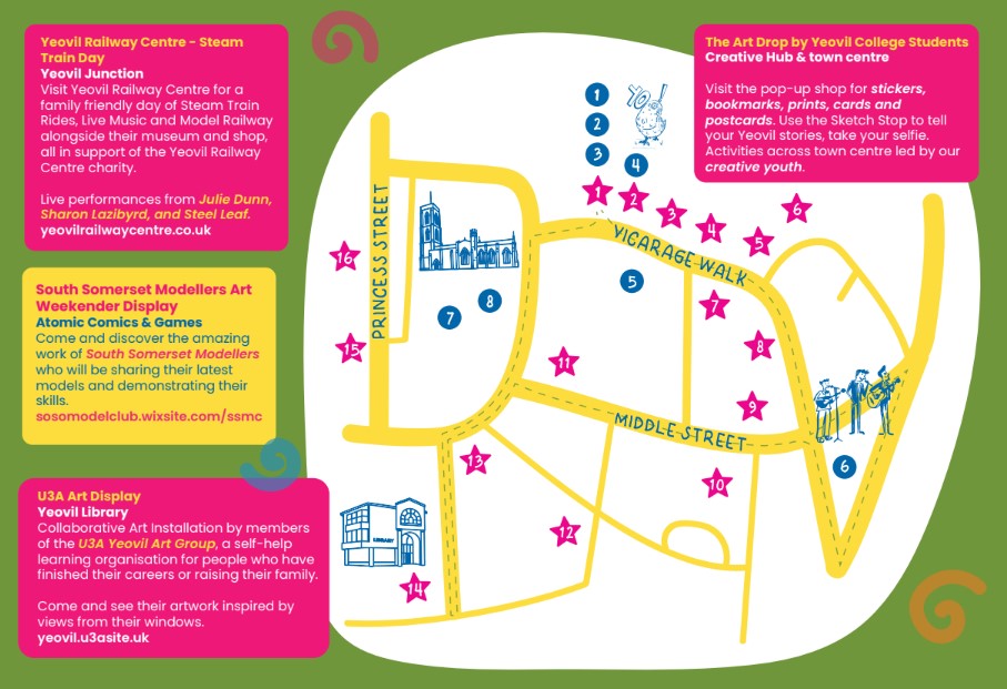 A brand new arts festival takes place across Yeovil Town Centre locations in March 2026, including events, new commissions, exhibitions and creative activities for all ages. Produced by Yeovil Art Space with a group of Yeovil artists who want to share their creativity with the community. Part of the OUR TOWN project funded by Arts Council England and supported by Somerset Council and Yeovil Town Council.
