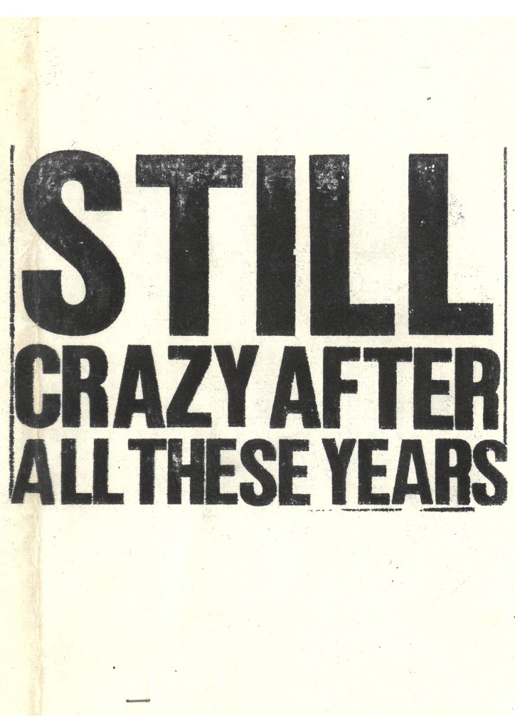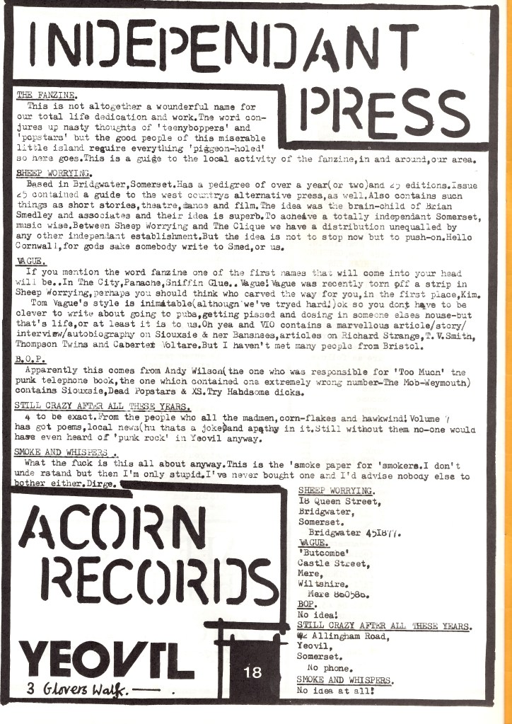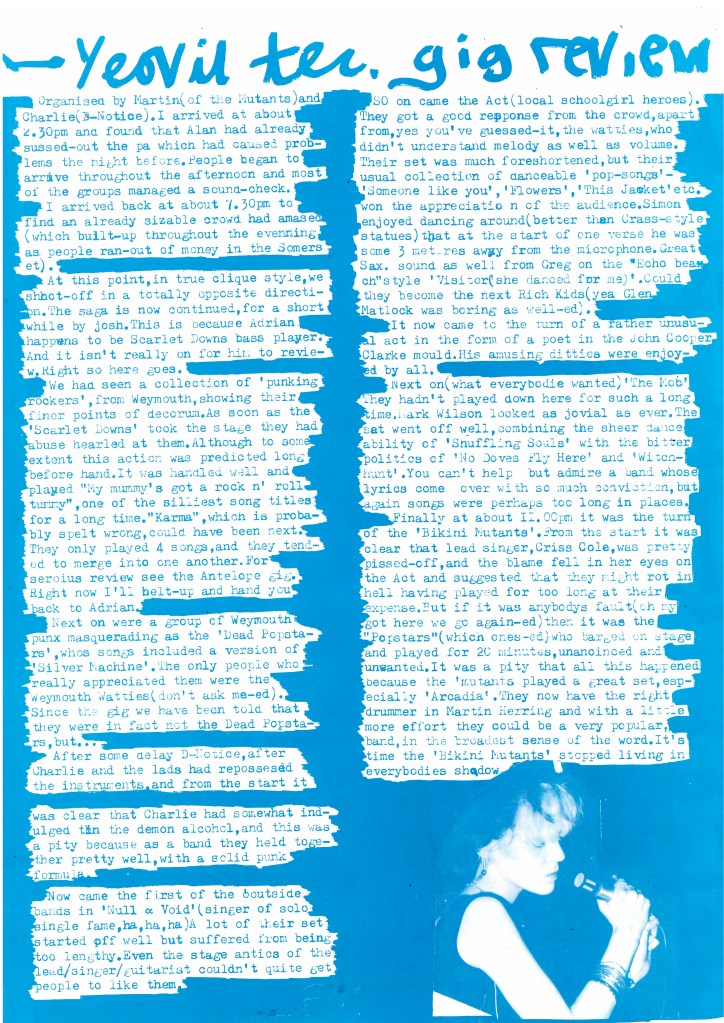 Celebrating the wealth of creativity in Yeovil through home-made music and its visual manifestation, the exhibition brings together a comprehensive collection of music fanzines circulated in and around Yeovil from the 70s onwards, including All the Madmen, Feeding the Fish, Still Crazy, Human Debris,Clique, Screed and other one-off wonders. It also shows original photos, artworks and rare finds contributed by individuals, especially for this exhibition.