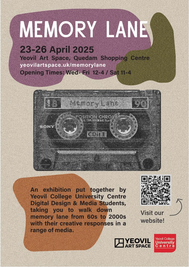 An exhibition put together by Digital Design & Media Students from the Yeovil College University Centre. Inviting you to walk down memory lane from the 1960’s to the 2000’s with their creative responses in a range of media.